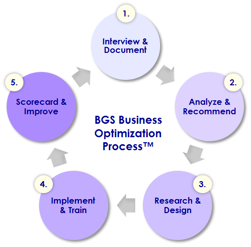 Through our five-step BGS Business Optimization Process, customized for each client and engagement, we take a deep-dive into an organization, assessing its specific needs and goals and mapping out a plan to help the business operate at optimum.